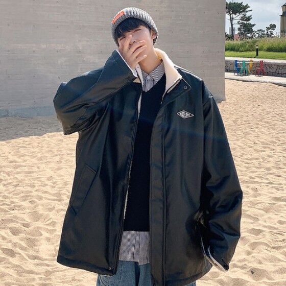 PU皮两面穿棉服男冬季潮牌宽松羊羔毛棉衣袄加肥大码胖子加绒外套